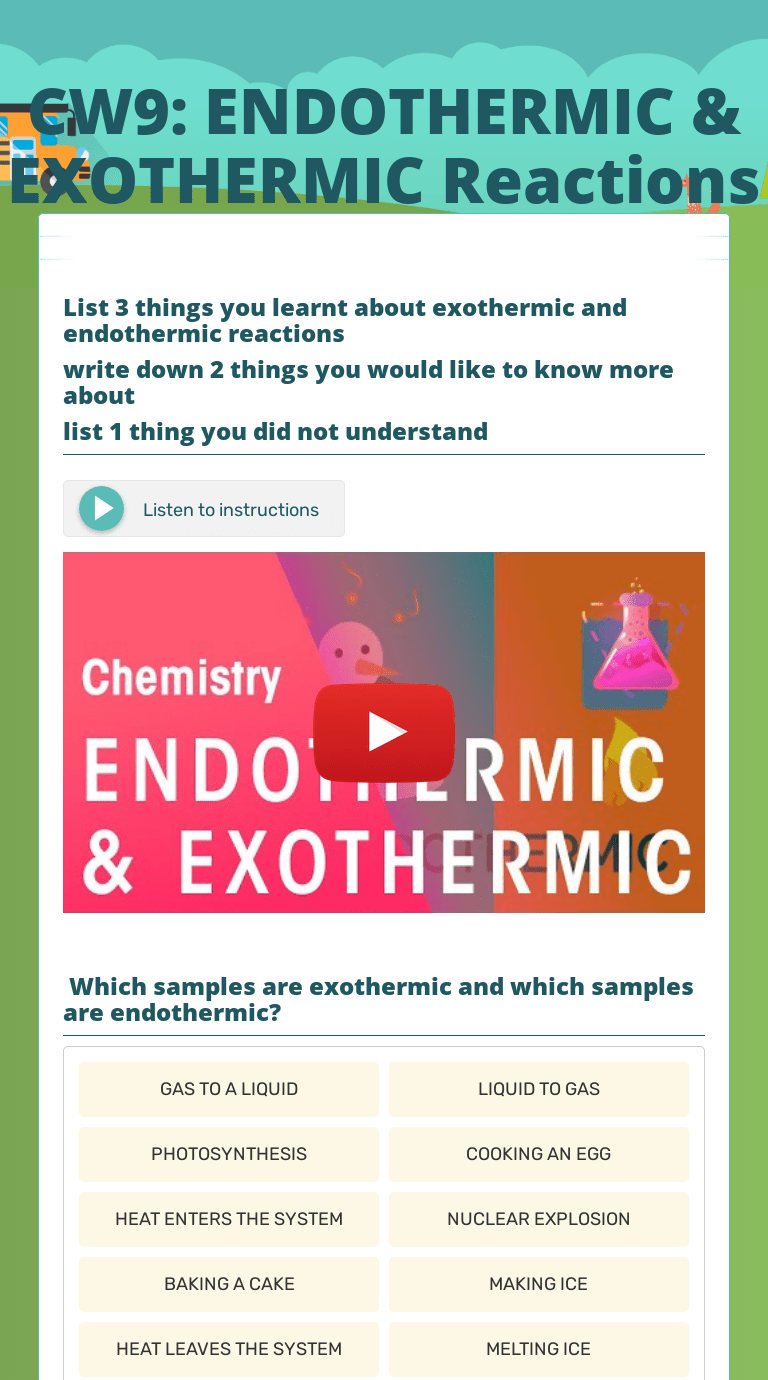 Test your knowledge of endothermic and exothermic reactions with a printable worksheet and interactive quiz. Endothermic and exothermic reaction worksheet. Find endothermic exothermic reactions lesson plans and teaching resources. Quickly find that inspire student learning. Students will be able to define an endothermic and .